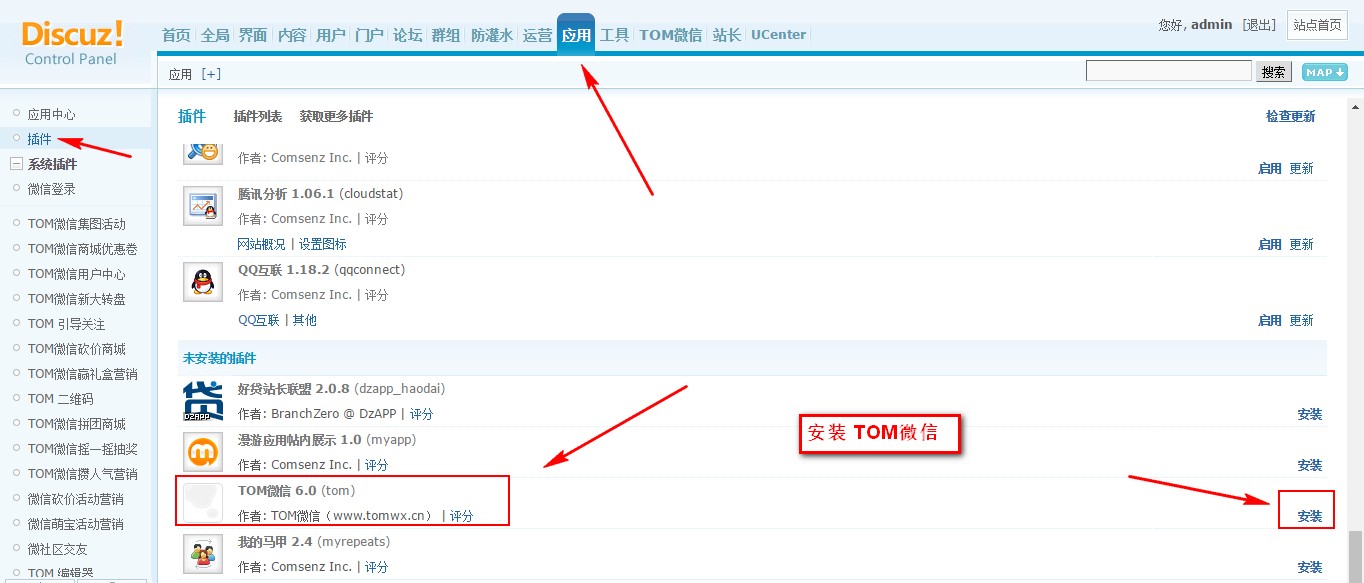 第二步:進入論壇后臺應用管理 》》 安裝 》》 點微(插件管理工具)